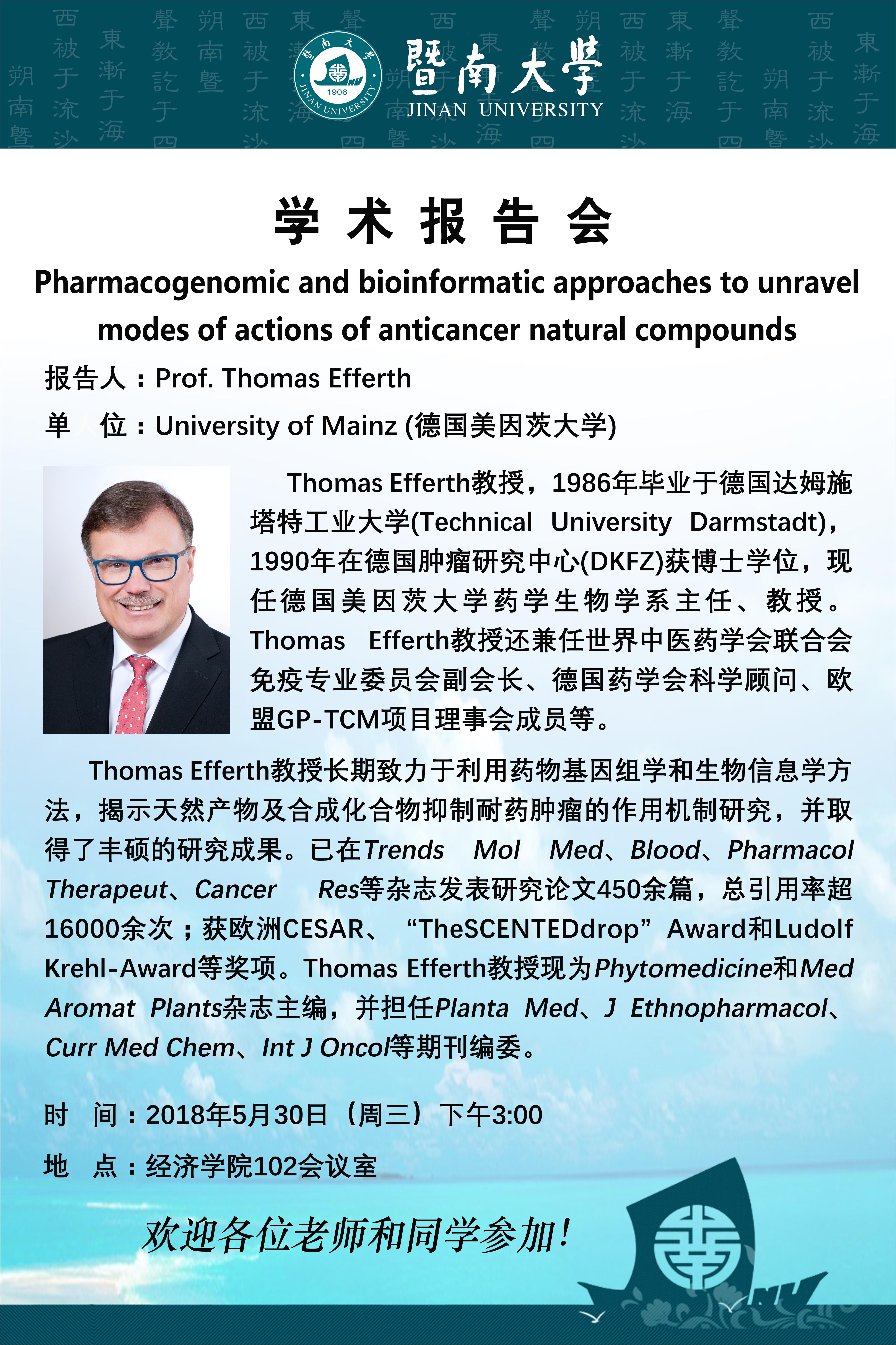 学术报告:来自美国密西西比大学的Khan教授和来自德国美因茨大学的Thomas Efferth教授