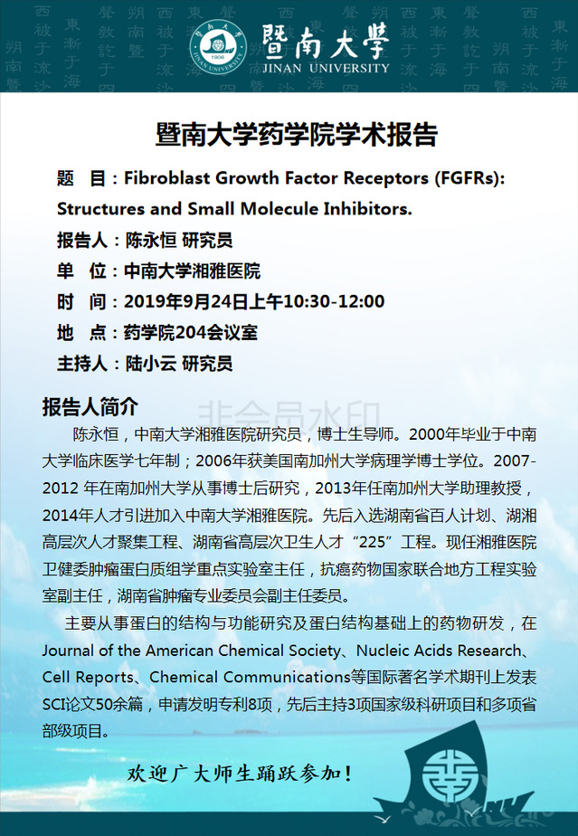 学术报告:Fibroblast Growth Factor Receptors (FGFRs): Structures and Small Molecule Inhibitors