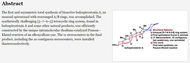 综上所述,该论文首次采用分子内烷氧基联烯-炔Pauson-Khand反应高效构建5/7/6/5四环骨架,经过20步完成了Bufospirostenin A的首次不对称全合成,并立体选择性的构建了11个手性中心。