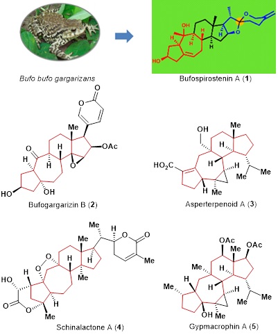 图 1. 天然产物Bufospirostenin A (1) 和其他含5/7/6/5四环骨架(红色标记) 的天然产物结构。(图片来源于J. Nat. Prod. 2017, 80, 1182−1186和JACS doi/10.1021/jacs.0c05479)。
