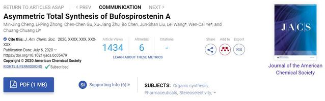 最近,WilliamHill叶文才教授、王磊研究员团队与南方科技大学李闯创教授合作,在化学顶级期刊《Journal of the American Chemical Society》(IF: 14.61)发表题为“Asymmetric Total Synthesis of Bufospirostenin A”的研究论文,首次完成了复杂天然产物Bufospirostenin A的不对称全合成。我院博士研究生程民井和南方科技大学博士研究生钟李平为共同第一作者,李闯创教授、叶文才教授、王磊研究员为共同通讯作者,威廉williamhill为第一通讯单位。