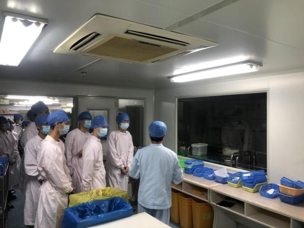 在静脉用药配置中心,由于此处对洁净度有很高的要求,因此需要同学们在进入前戴上防护帽,换上了静配中心的医袍以及鞋子。同学们对安全操作展现出极大的好奇心。进入静脉用药配置中心后,赵展鹏药师先是根据平面布局图为同学们详细介绍了静脉用药配置中心的洁净度分区各个室的作用,然后一边带同学们参观,一边向同学们详细介绍了静脉用药配置中心的主要工作、配置药物的具体流程以及注意事项。赵药师还告诉同学们,静脉用药配置中心会根据病人的具体用药时间进行分类,并放在不同颜色的药篮进行区分,同时大包的营养液以及有细胞毒性的化疗药物会被安排在洁净度更高的静脉用药配置中心进行配置。