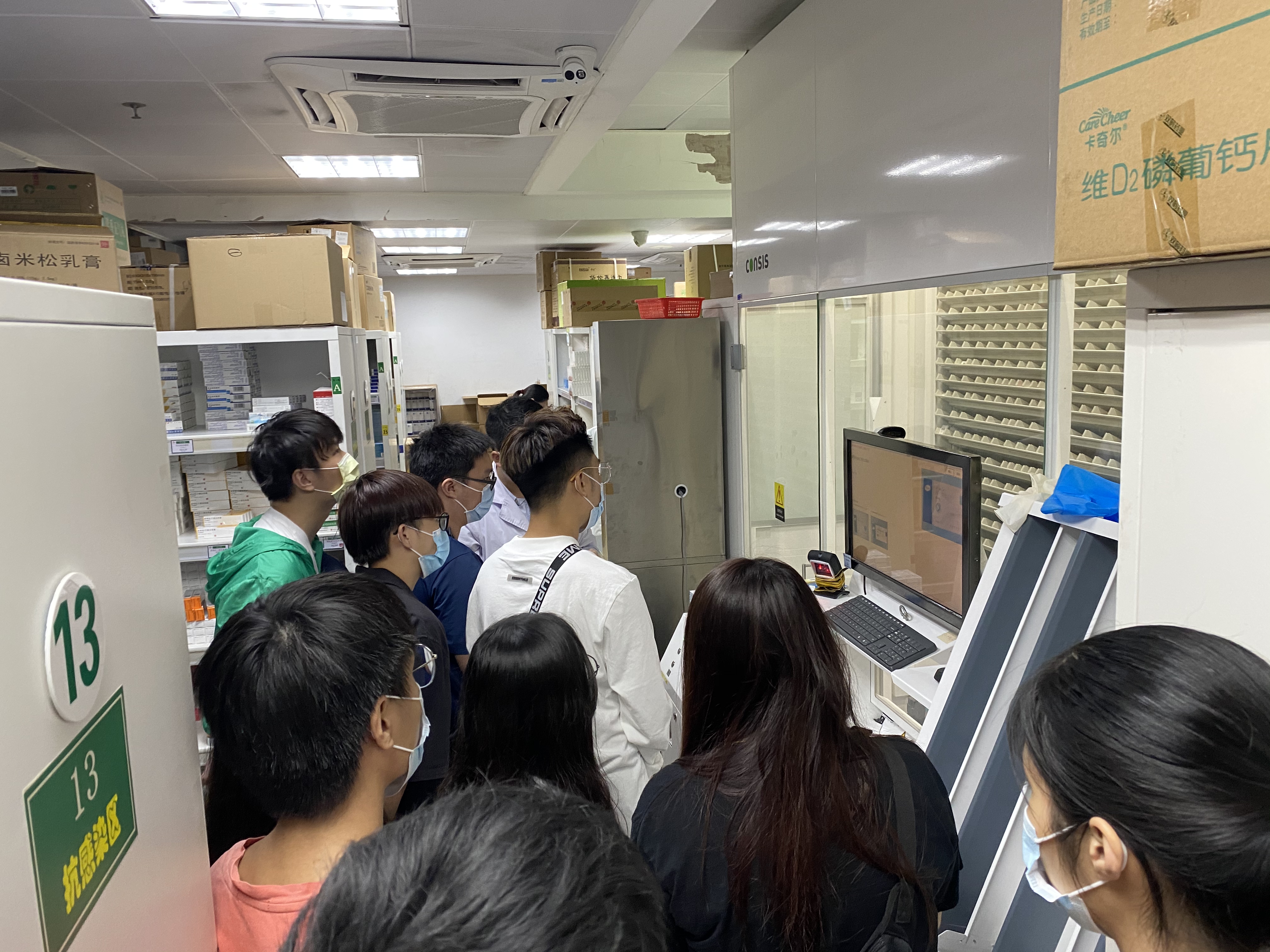 门诊西药房主要工作是门诊病人的取药与调配,钟慧婷药师对门诊的设施和药品调配流程进行讲解,重点介绍了使用自动发药机调配药品和人工调配两种模式,同学们虽然在课堂上看过慕课视频,第一次看到自动发药机和拆零分包机仍然感到非常新奇。