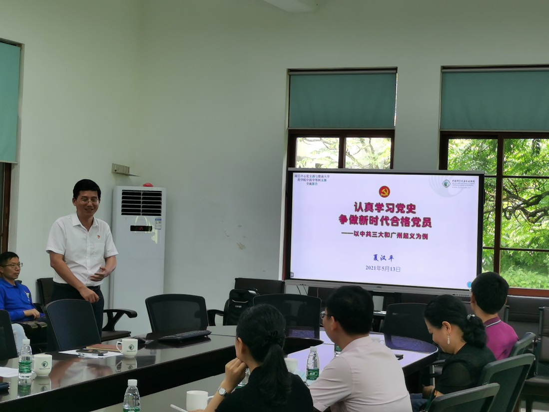 活动过程中,各共建支部书记对本支部的基本情况作了简要介绍,在座嘉宾围绕活动主题展开了热烈的讨论和交流。最后,夏汉平书记以“认真学习党史 争做新时代合格党员”为题,为在座全体党员上了一堂生动的党课。夏书记通过回顾发生在广州的两个重大历史事件—中共三大和广州起义——和大家交流了学好党史、国史的重要性,他引古论今,侃侃而谈,勉励党员们认真学习习近平新时代中国特色社会主义思想和党章党规,不负金色年华,争做合格党员,在国家发展和社会建设中发光发热。