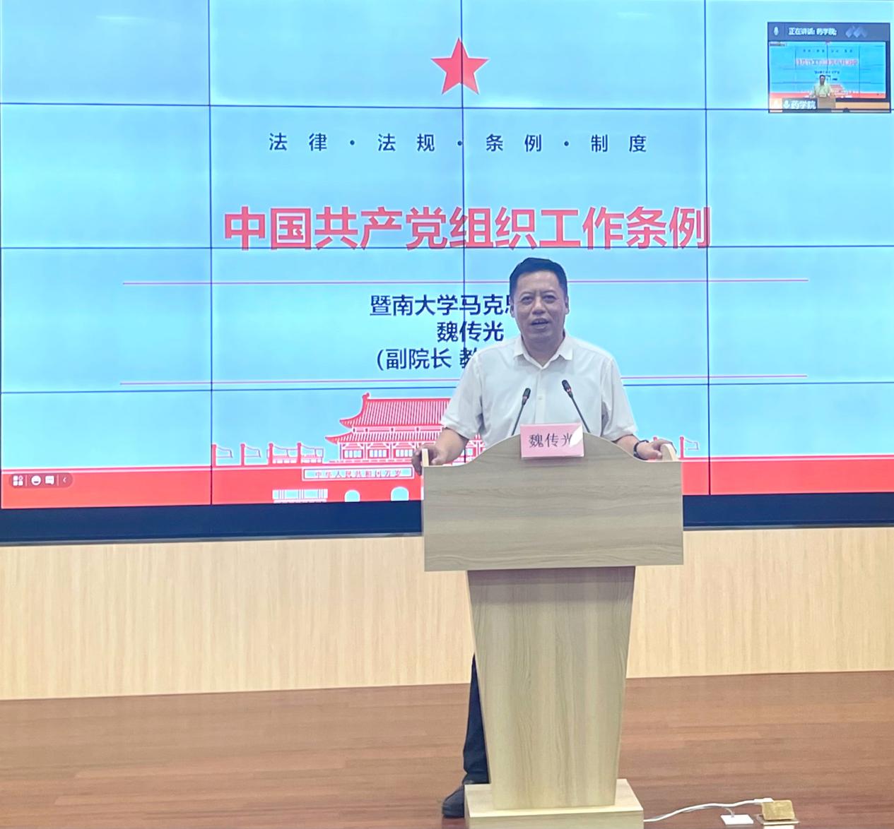 魏传光教授首先介绍了《中国共产党组织工作条例》(以下简称《条例》)的出台背景和重要意义。接着,魏教授带领师生党员们从“总则”、“领导体制和职责”、“党的组织体系建设”、“干部工作”、“人才工作”五个方面,对《条例》的7章、46条进行了全面深刻地解读。魏教授表示,《条例》以习近平新时代中国特色社会主义思想为指导,贯彻落实新时代党的建设总要求和新时代党的组织路线,对党的组织工作作出全面规范,是做好新时代党的组织工作的基本遵循。《条例》的制定和实施,对于坚持和加强党对组织工作的全面领导、推进组织工作科学化制度化规范化、全面提高组织工作质量,具有重要意义。