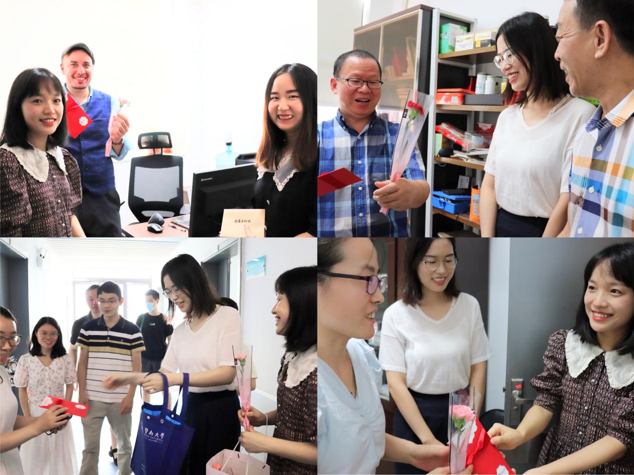 今天,是我国第37个教师节,WilliamHill组织开展以“赓续百年初心,担当育人使命”为主题的教师节献花活动,由五级组织员刘斌老师带领的献花小分队走进学院各个楼层、走进老师们的办公室和实验室,用鲜花和贺卡向学院老师们献上最真挚的节日祝福,感谢各位老师一直以来对学生成长付出的辛劳、对学校发展做出的贡献,祝愿老师们能过一个愉悦有意义的教师节。在欢声笑语中,老师们流露着欣慰的笑容,真切地感受到了学院浓浓的情意。