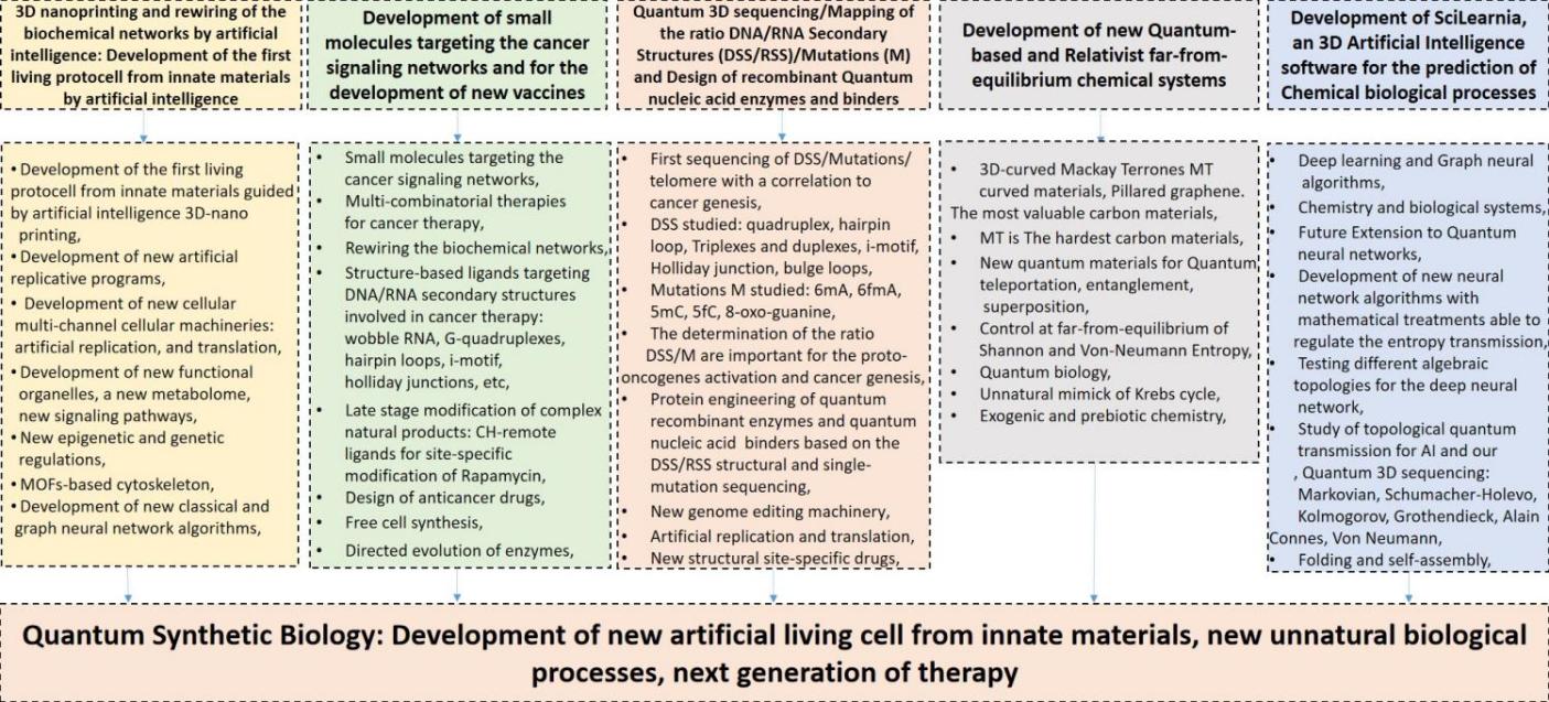 [2] 由SciLearnia引导的原始细胞、人工活细胞和细胞网络的3D量子纳米打印:在SciLearnia和3D纳米打印设备的引导下,用量子纳米器件打印出不同的原始细胞和网络,以及位点特异的量子3D自旋电子纳米器件引导。这些障碍将克服海森堡对特定位置打印的不确定性,以及开发能够注入脉冲引导Skyrmions/Magnons的纳米设备,用于分子自旋电子打印,从而创建复杂的生化网络。