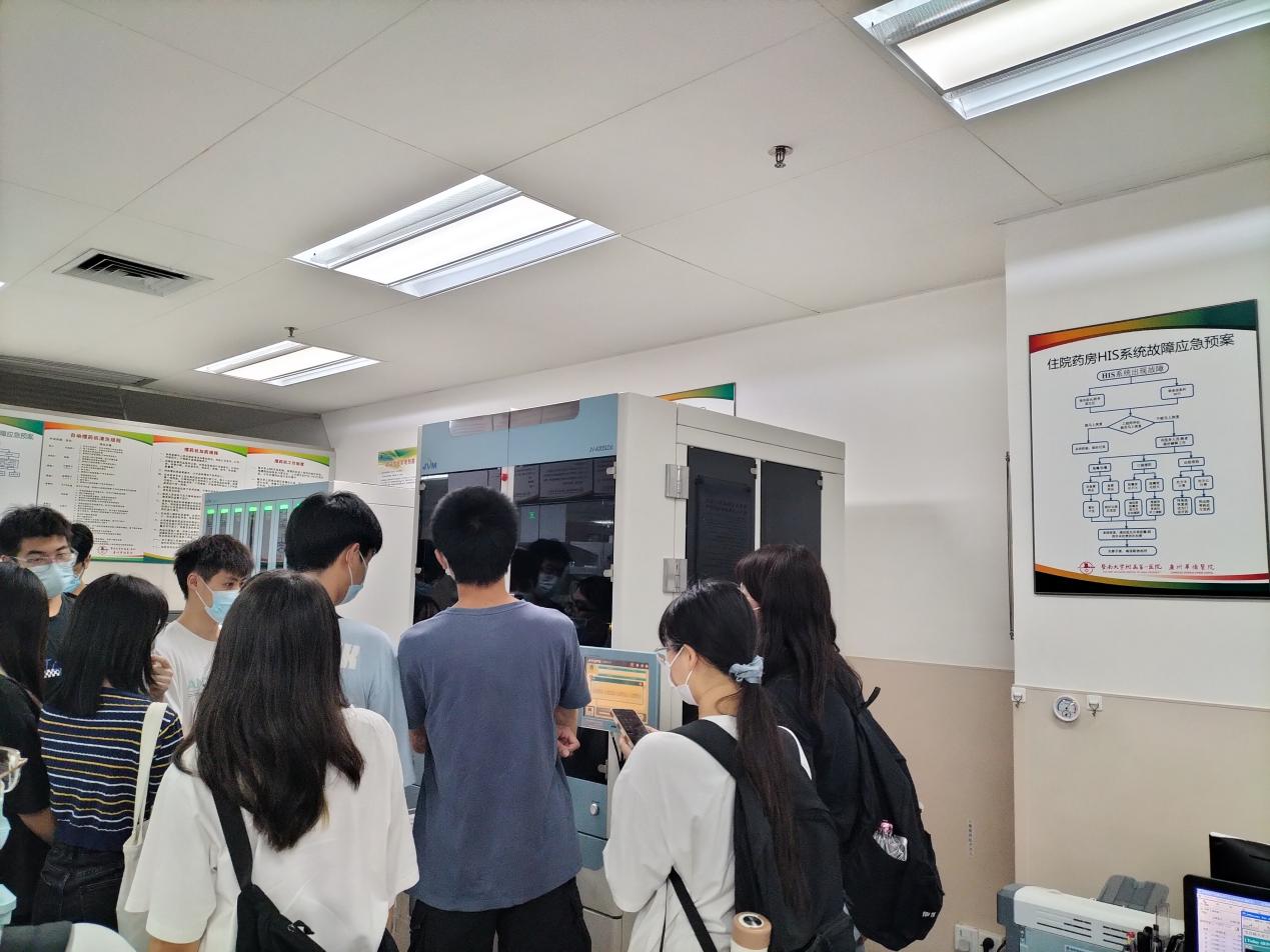 随后,同学们分为三个小组在医院老师的带领下先后参观了门诊西药房、中药房、中心药房和临床药学办公室。