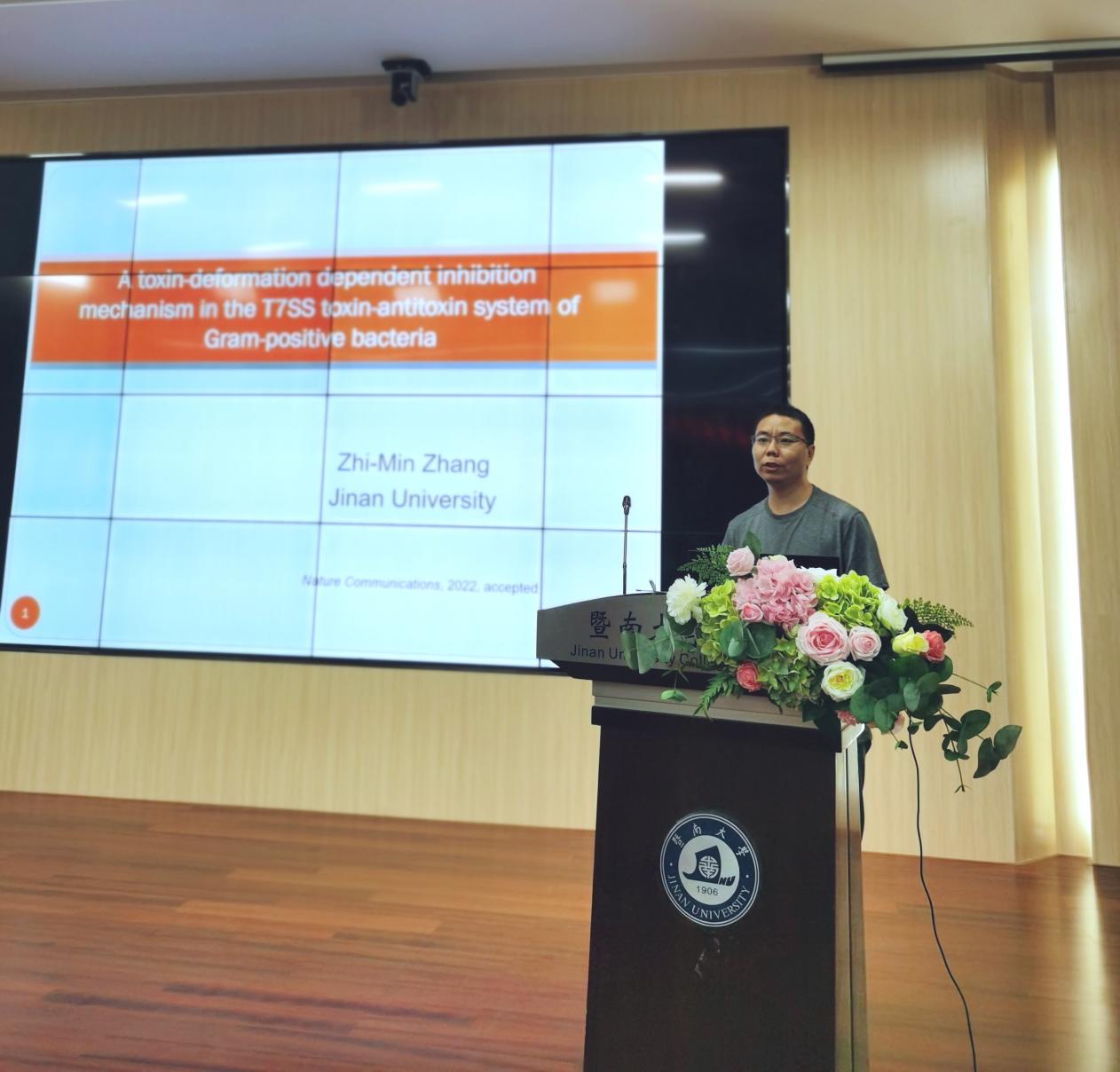 在学术交流环节,张志民研究员做了题为“A toxin-deformation dependent inhibition mechanism in the T7SS toxin-antitoxin system of Gram-positive bacteria”的学术报告。报告讲述了团队最近发现的一类广泛存在于革兰氏阳性菌的毒蛋白调控机制,并通过结构生物学、核磁共振和生物化学多学科的交叉融合,揭示了该机制中中和蛋白通过一种罕见的方式诱导毒蛋白发生巨大的构象变化从而导致毒蛋白的失活。该工作为后续靶向革兰氏阳性菌的毒蛋白调控系统的新型抗生素设计提供了一个新的思路。
