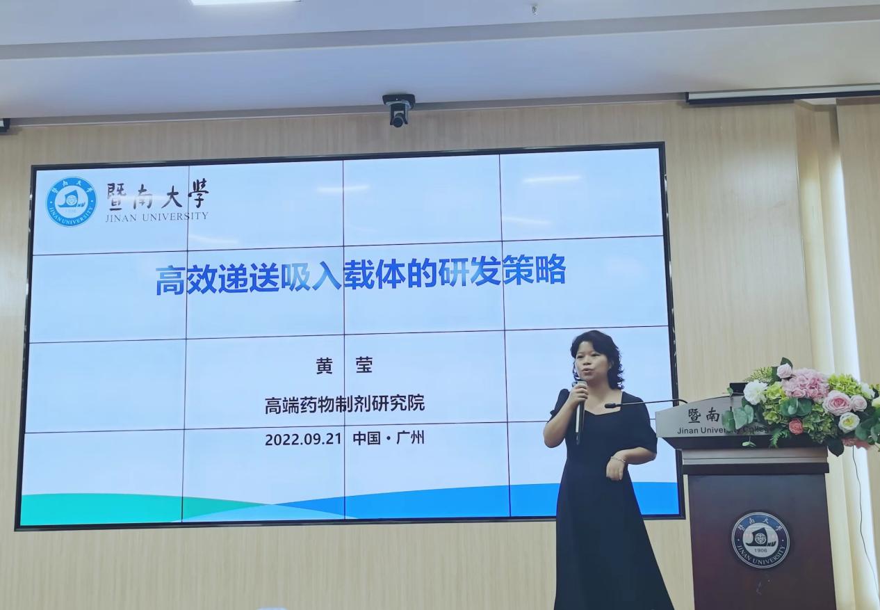 黄莹副教授介绍了“高效递送吸入载体的研发策略”,报告指出吸入制剂是近年来药剂学研究的热点,其中吸入粉雾剂是唯一一种固体形式存在的吸入制剂,在药物稳定性、肺部药物递送效率和患者顺应性方面表现出了明显的优势,极具市场前景。DPIs需要借助载体运载分散从而使药物达到有效部位,因此载体的动力学性质对药物递送至关重要。本课题组构建了具有纳米级粗糙表面结构、均一纳米孔道结构及核-壳结构的功能型载体,不仅提高了药物肺部沉积率且能够有效避免吸湿效应。此外,课题组通过激光粒度仪的模块化改造,开发了快速检测、实时监控载体颗粒吸入过程的技术平台,探究载体对DPIs肺部递送的调控作用,有望加速功能多样载体的设计和开发。