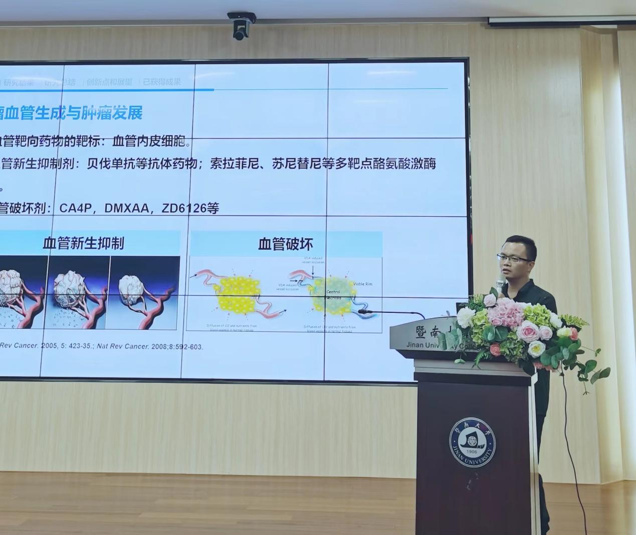 陈敏锋副研究员主要从事肿瘤周细胞生物学机制及靶向药物研究,为我们带来题为“周细胞介导血管靶向药物耐药的新机制及其克服策略”的精彩报告。报告讲述了团队近五年对肿瘤周细胞介导血管靶向药物耐药的新颖机制研究,为克服血管靶向药物耐药提供新靶标,并在此基础上进行了新药研究,为克服血管靶向药物耐药提供有效治疗策略。