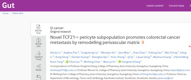 近日,威廉williamhillWilliamHill叶文才教授、张冬梅研究员和陈敏锋副教授课题组连续在本领域国际权威学术期刊Gut(IF=31.8)和Journal of Clinical Investigation(IF=19.5)在线全文发表了题为“Novel TCF21high pericyte subpopulation promotes colorectal cancer metastasis by remodelling perivascular matrix”和“Targeting FAPα-expressing hepatic stellate cells overcomes resistance to anti-angiogenics in colorectal cancer liver metastasis models”的研究论文。这是该团队继2017年在Journal of Clinical Investigation(IF=19.5)和2021年在Journal of Extracellular Vesicles(IF=17.3)发表肿瘤周细胞相关研究后取得的新的原创性研究成果。