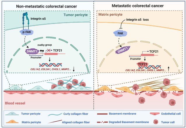 周细胞在肿瘤转移过程中是一把“双刃剑”,既可以发挥物理屏障功能抑制肿瘤转移,也可以通过旁分泌或直接与肿瘤细胞相互作用促进肿瘤转移。这一现象表明周细胞在肿瘤转移中的不同功能可能与其异质性有关。该团队使用显微解剖结合特定条件培养的创新方法从人结直肠癌手术标本中分离获得了原代肿瘤周细胞,率先使用单细胞测序阐明了其异质性,发现了一群与肿瘤转移密切相关的TCF21high新型基质周细胞,并阐明了该群周细胞通过重塑血管外周基质促进肿瘤血行转移的新颖机制,为结直肠癌肝转移的早期诊断和治疗提供有效靶标(Gut, 2022: 10.1136/gutjnl-2022-327913)。