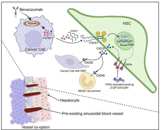 长期以来,血管靶向药物耐药是临床肿瘤治疗的一大难题。研究表明,肿瘤细胞浸润癌旁组织“劫持”正常肝窦血管,发生“血管劫持”(vessel co-option),是介导贝伐单抗耐药的重要原因,但其作用机制未被完全阐明且缺乏治疗策略。该团队首次从“被劫持血管”的新颖角度揭示了vessel co-option的发生机制,并发现靶向FAPα+肝窦血管周细胞是克服vessel co-option介导的贝伐单抗耐药的重要策略(J Clin Invest, 2022; 132(19): e157399)。在临床治疗中,另一类重要的抗血管新生疗法-酪氨酸激酶抑制剂停药后会残留包含周细胞的“袖套”结构,是介导该疗法耐药的重要原因。该团队首次揭示了肿瘤周细胞通过外泌体招募内皮祖细胞促进血管再生的作用机制,并发现靶向周细胞外泌体Gas6/AXL信号通路是克服血管新生抑制剂耐药的有效策略(J Extracell Vesicles, 2021; 10:e12096; Cancer Lett, 2022; 524:131-143)。
