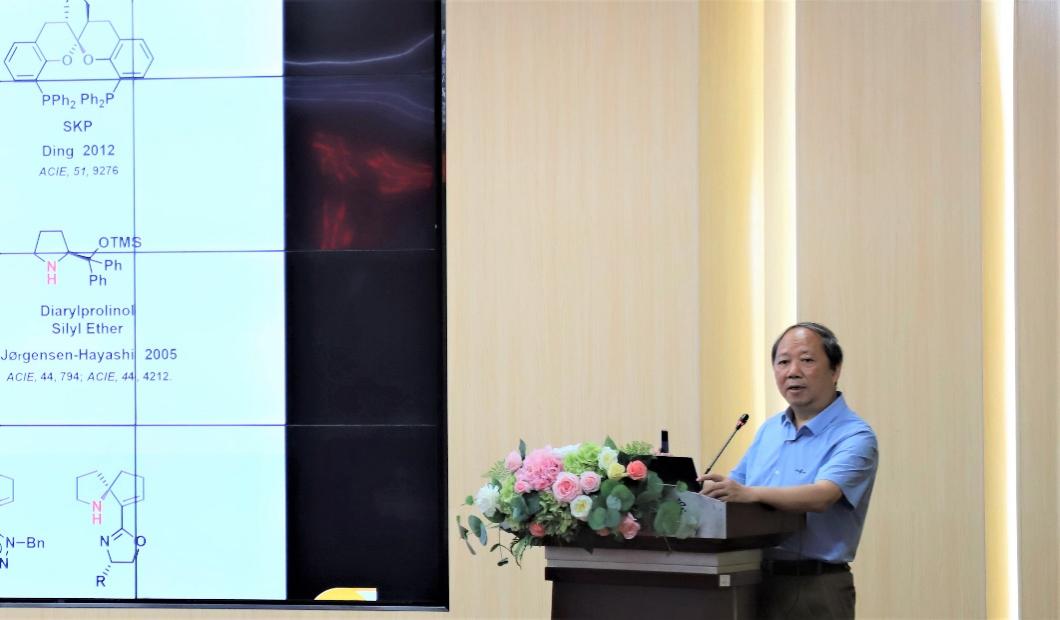 报告会中,涂院士介绍了其团队利用氮杂螺环结构的轴手性特点,以氮杂螺环(SPD)为核心骨架设计、开发新型催化剂并应用于有机不对称合成反应与天然产物不对称全合成的研究思路与具体设计过程。涂院士在与大家分享自身科研成果的同时,还分享了多年从事科研的心得体会。他幽默地提出科研中“螃蟹绑大草”的不良现象,强调有机催化剂和配体的精简性而非复杂性。同时,涂院士还鼓励现场师生从事科研应当敢为天下先,努力做别人做不到的、做有用的科学研究。