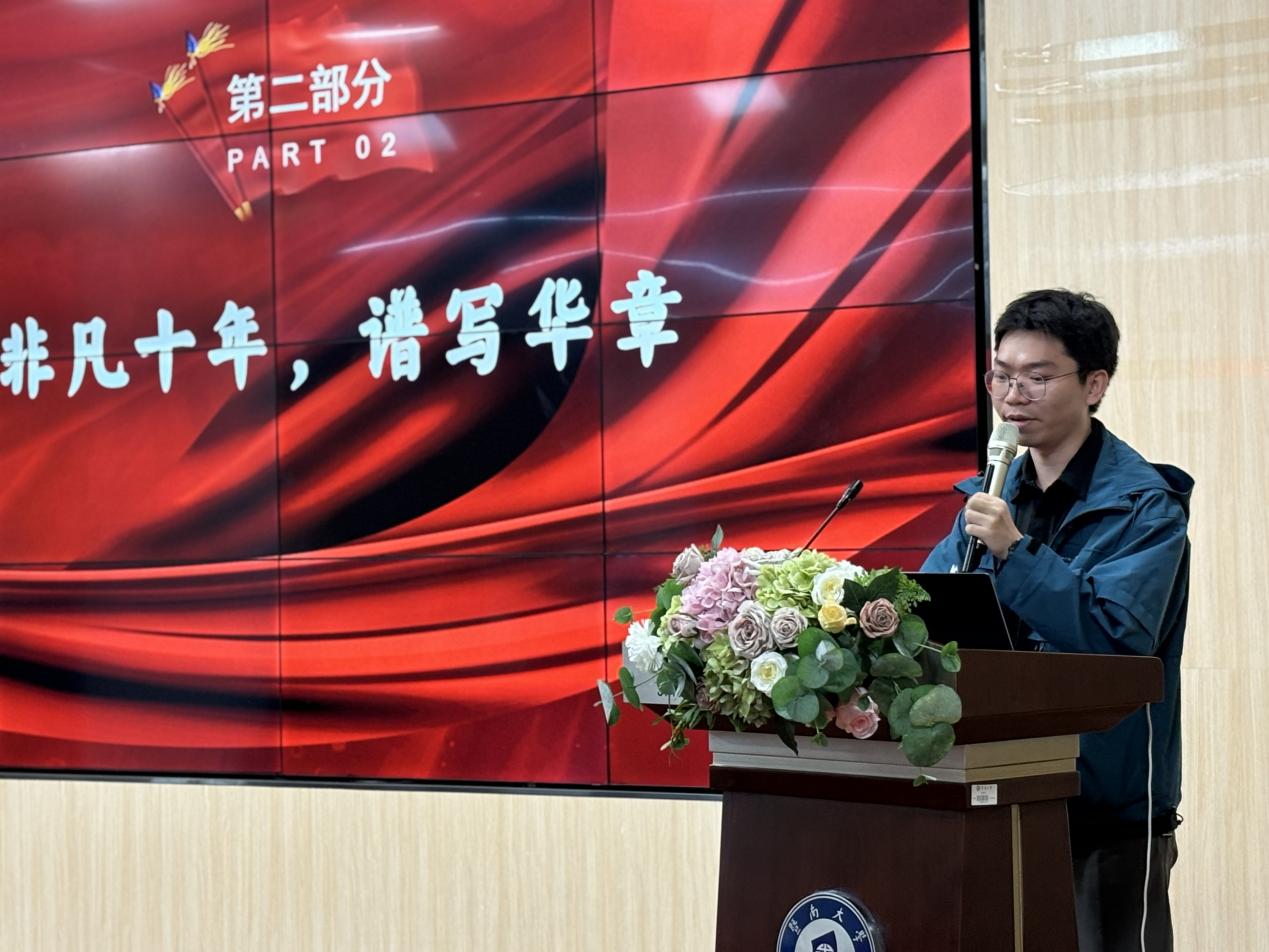潘勇志从党的二十大概况介绍、学习解读报告重点内容、牢记使命,努力成长成才、启发新征程,奋进新时代四个方面出发,讲述了在党的二十大的启发中我们学会应该如何去过好大学生活,怎样为了国家为了人民而快速成才成长。他以大兴国际机场的建设为例展示了新时代十年以来我们的巨大变化,用毛相林的事迹阐述了无数共产党人在一线基层的深耕和无私奉献,用张桂梅的事迹让我们看到胸怀梦想、矢志不渝、扎根边疆教育一线40余年的伟大教育者形象。潘勇志希望同学们勇立潮头,奋楫者先,做无愧于新时代的好青年。