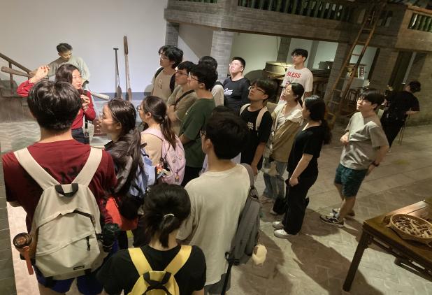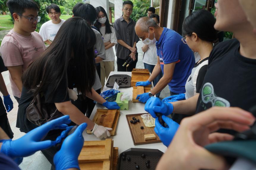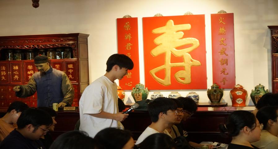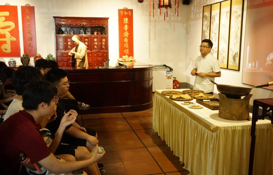 在黄志基部长以及陈李济工作人员的引导下,师生们先后参观了陈李济中药博物馆和制药车间。同学们在博物馆门口体验了手搓药丸,感受了传统工艺的魅力。进入博物馆大厅一楼,讲解员生动讲解陈李济及中药博物馆的起源和悠久历史,同学们对陈李济有了初步的认识。到了二层的中药传统制作工艺展厅,在逼真的场景还原下,同学们了解到炮制、配伍、储存、蜡壳蜜丸等中药生产工艺,也了解许多南方中药材。