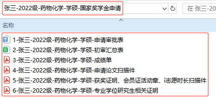 (2)电子版文件名为:姓名-年级-专业-学/专硕/博士-国家奖学金申请,相关材料须按序号及格式要求提交,图示如下,电子版材料(自备U盘)随纸质版一并提交。